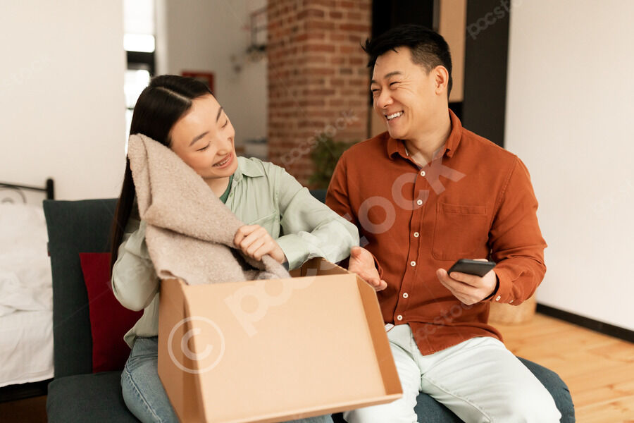Black woman wearing headscarf taking shirt out of delivery box while standing at home