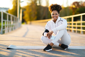 Black woman with short hair sitting with clasped hands at table with laptop and tablet in office