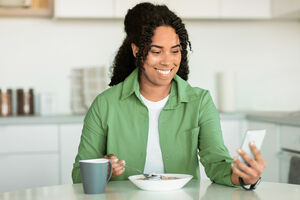 Smiling Black woman with short hair holding smartphone sitting at table with laptop and coffee mug in office