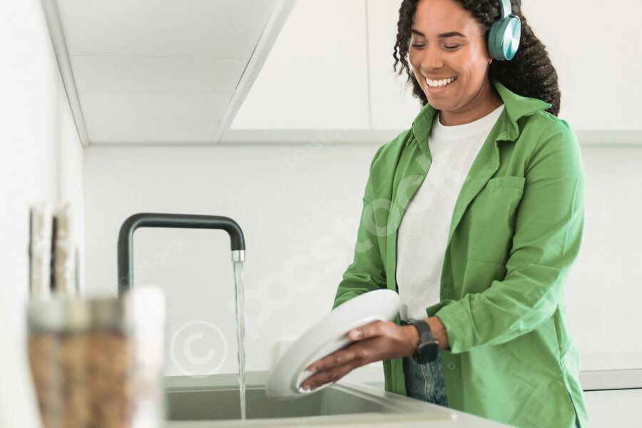 Black woman with short hair listening to music on headphones sitting at table with laptop in office