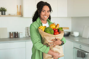 Smiling Black woman with curly hair looking away and resting chin on hand while sitting at table with her breakfast and glass of juice in dining room at home