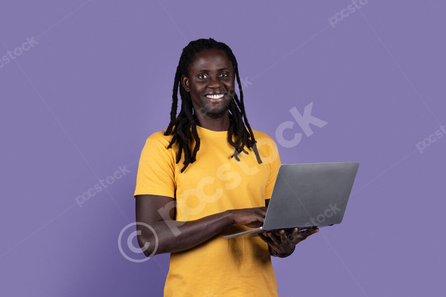 Cheerful Black male dentist holding tablet while standing in dental clinic