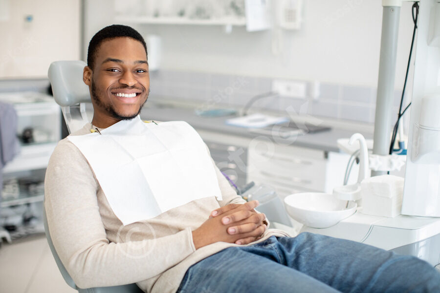 Black man wearing disposable bib smiling wide after dental treatment while sitting on chair in clinic