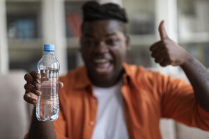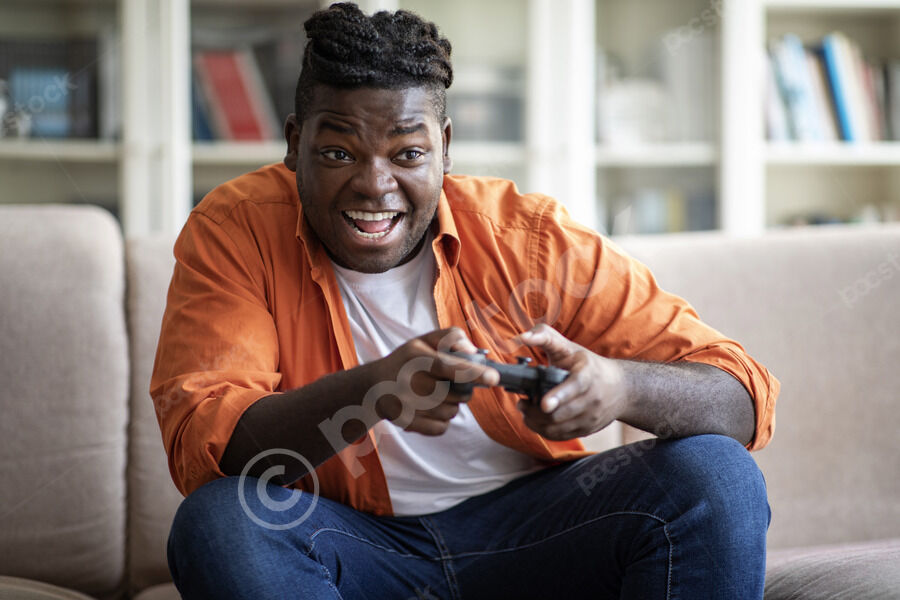 Black man wearing disposable bib smiling wide after dental treatment while sitting on chair in clinic