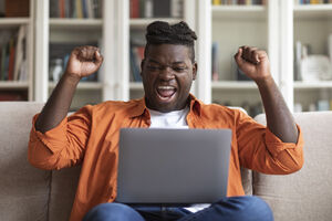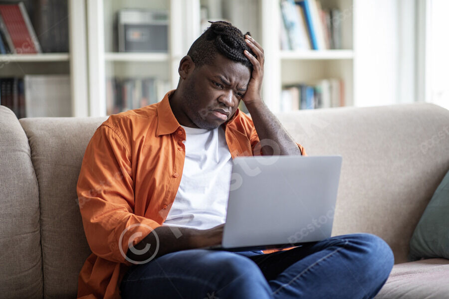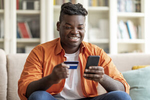 Black pregnant woman and husband using laptop together holding credit card doing online shopping while sitting on sofa in living room at home
