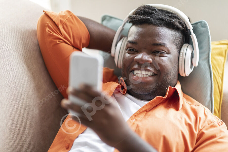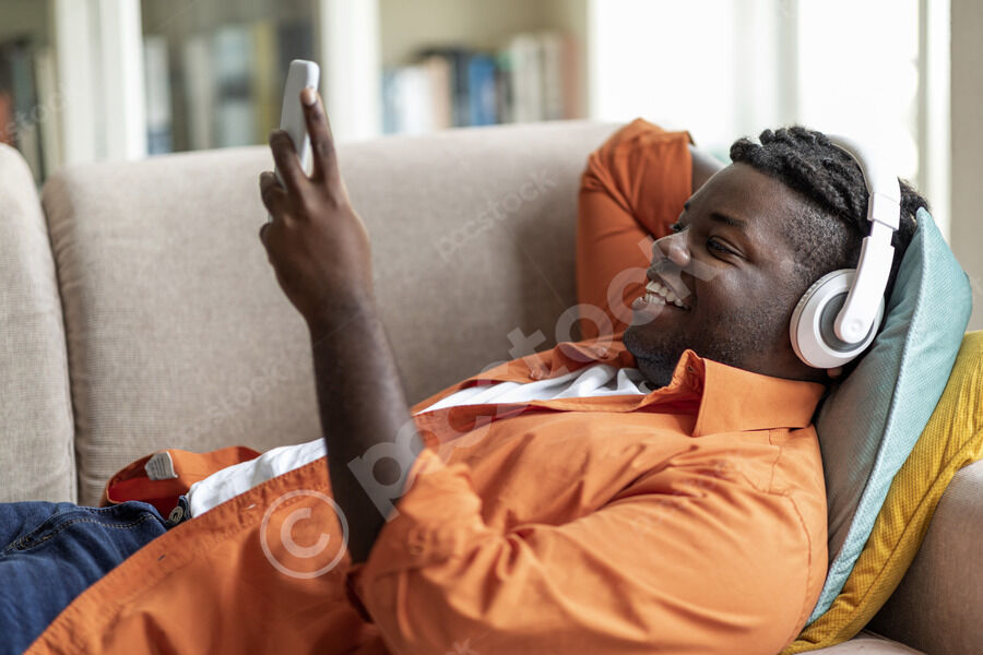 Black pregnant woman lying on lap of husband looking at each other talking while sitting on sofa in living room at home