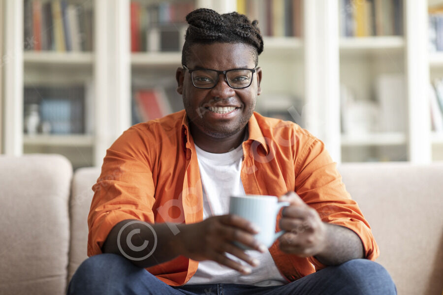 Cheerful Black male dentist with clasped hands leaning on dental chair while sitting in clinic