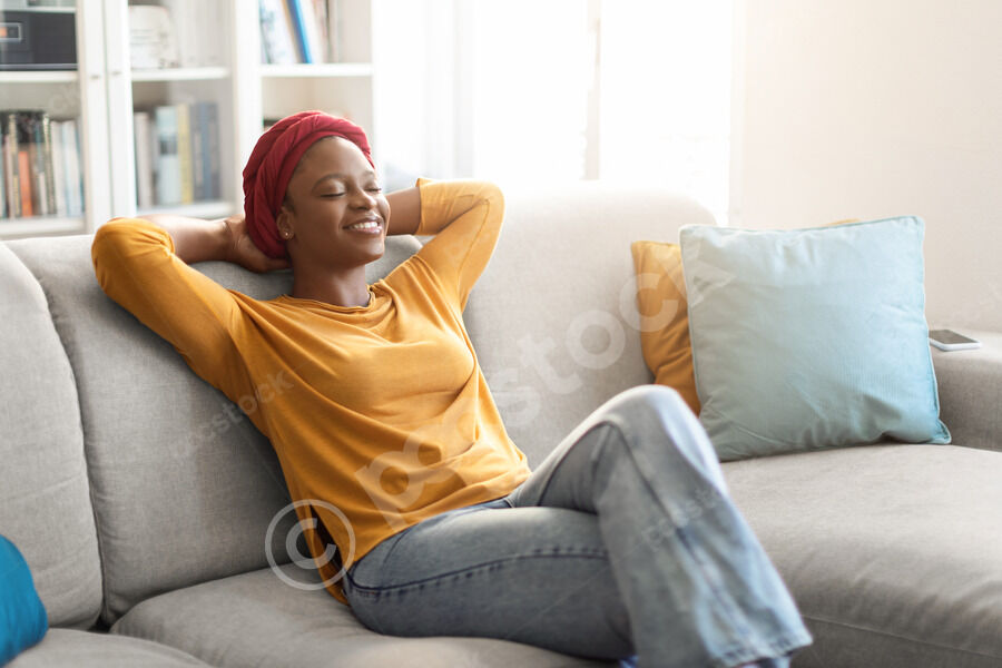 Black woman with closed eyes wearing headphones listening to music leaning back while sitting on sofa at home