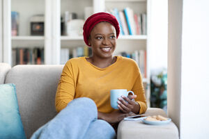 Black woman using smartphone holding cup of coffee while sitting on sofa in living room at home
