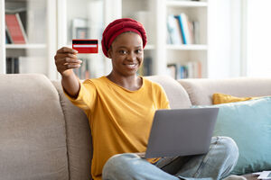 Black woman holding credit card using laptop doing online shopping sitting on sofa in living room at home