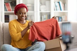 Black woman with braids using laptop holding documents leaning arm on sofa while sitting in living room at home