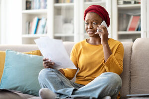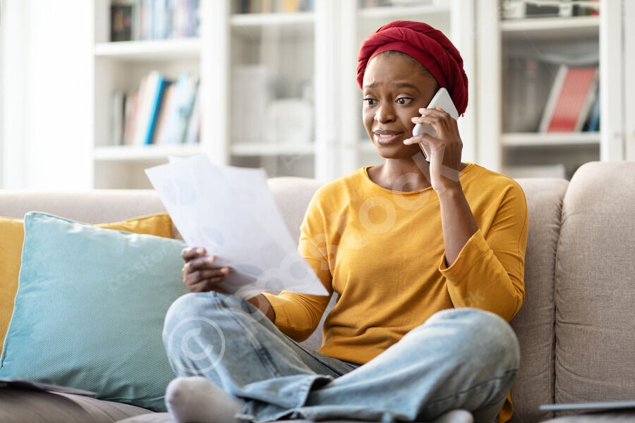 Black woman with braids having phone call holding documents looking at laptop leaning arm on sofa while sitting in living room at home