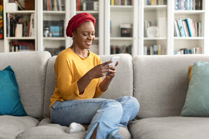 Black woman with long braids using smartphone sitting on sofa in living room at home