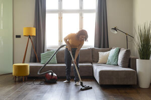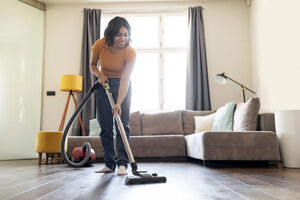 Hispanic female teenager using vacuum cleaner in cleaning wooden floor in living room at home