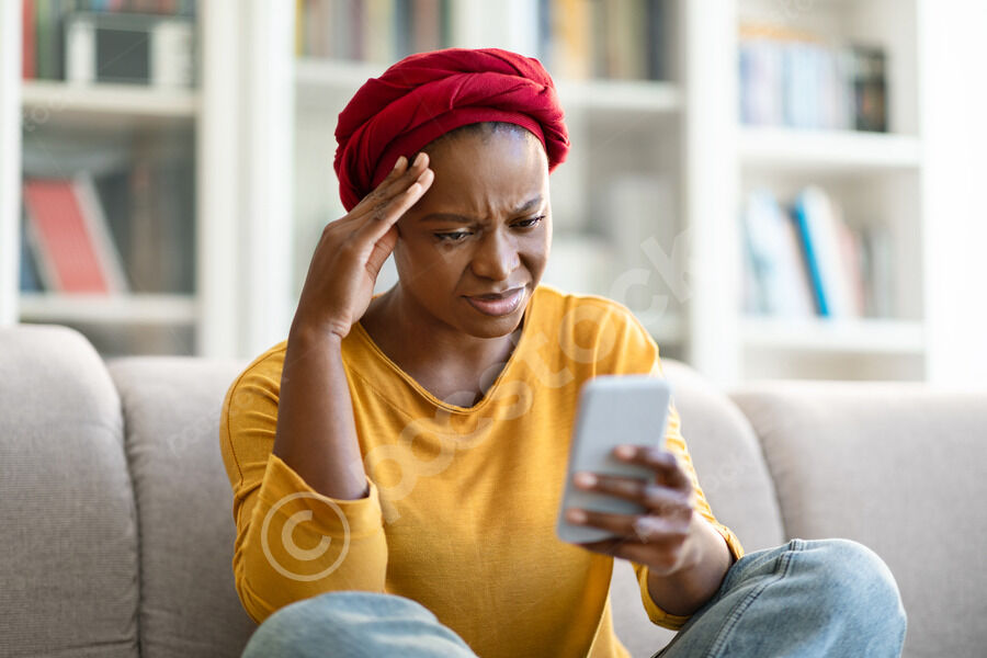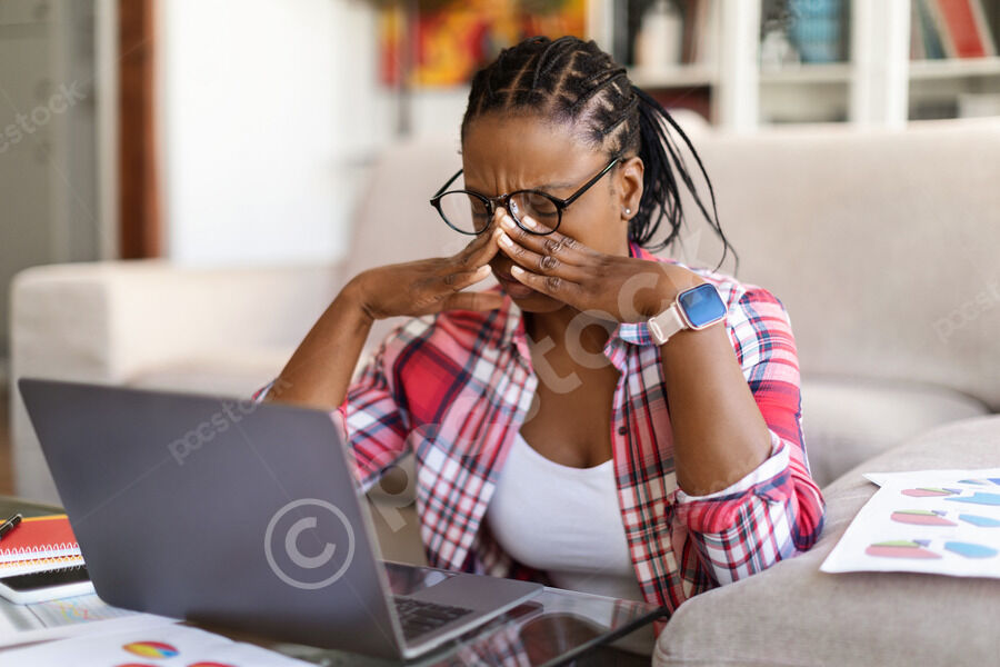 Depressed Hispanic woman wearing face mask sitting by the window at home