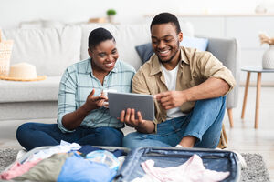 Smiling Hispanic woman holding pregnancy test kit sitting on couch at home