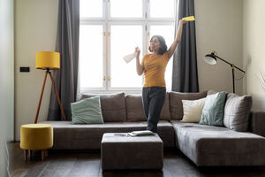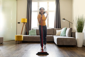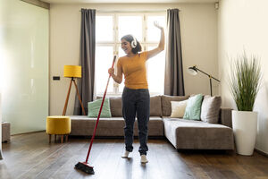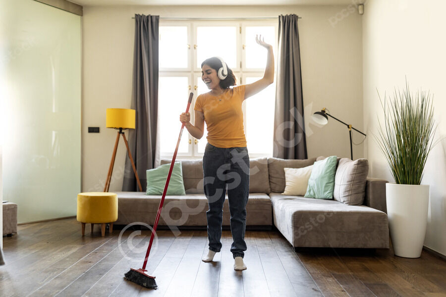 Hispanic female teenager wearing headphones and rubber gloves singing into mop handle while standing and cleaning the living room at home