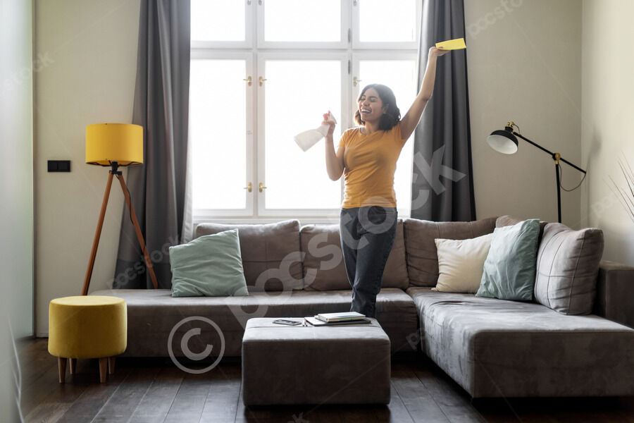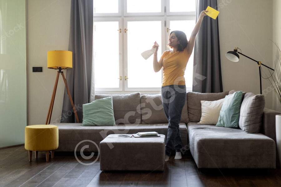Hispanic female teenager holding rag and sprayer having fun cleaning the living room at home