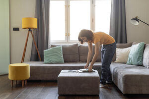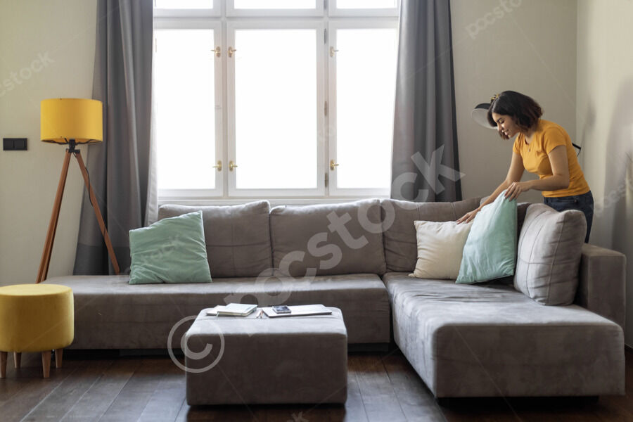 Hispanic female teenager fluffing couch cushions while cleaning the living room at home