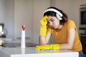 Tired Hispanic female teenager wearing headphones and rubber gloves leaning face on hand with closed eyes feeling exhausted after cleaning kitchen counter at home