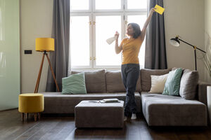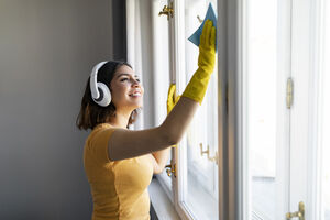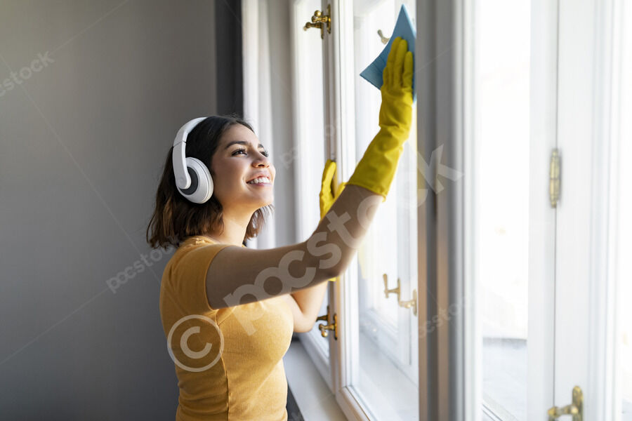 Hispanic female teenager wearing headphones and rubber gloves standing and using rag in cleaning window at home