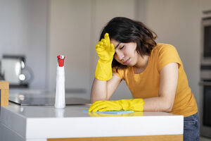 Tired Hispanic female teenager wearing rubber gloves leaning face on hand with closed eyes feeling exhausted after cleaning kitchen counter at home