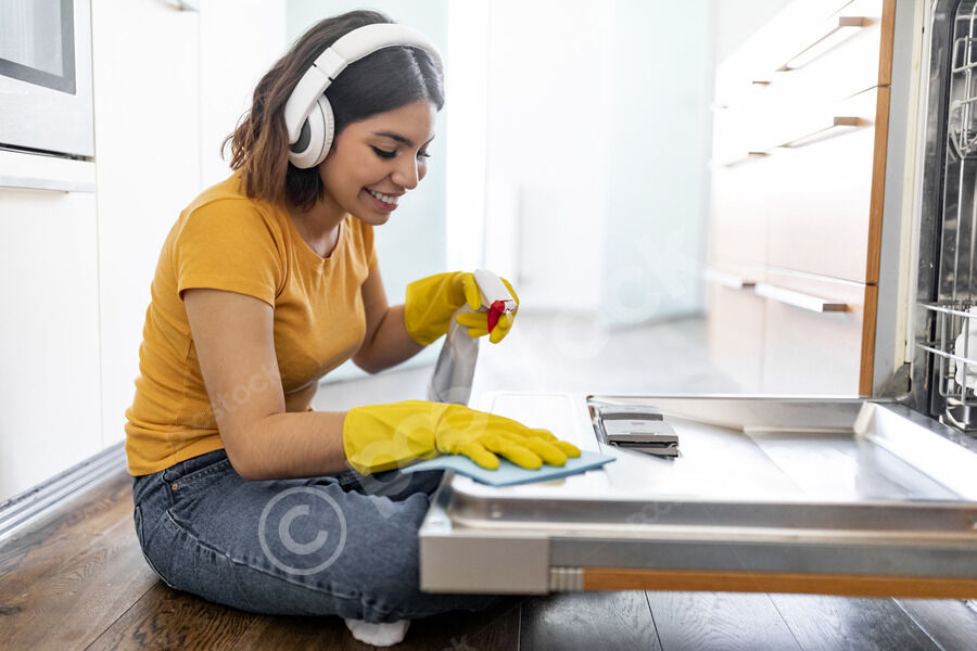 Hispanic female teenager wearing headphones and rubber gloves using rag and sprayer in cleaning dishwasher machine surface while sitting on floor in kitchen at home
