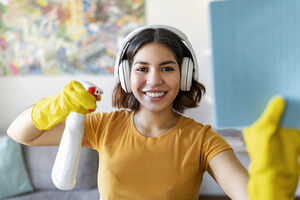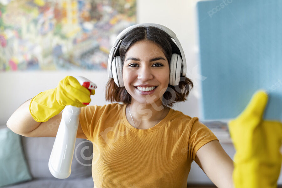 Hispanic female teenager wearing headphones and rubber gloves using sprayer and rag in cleaning supplies at home