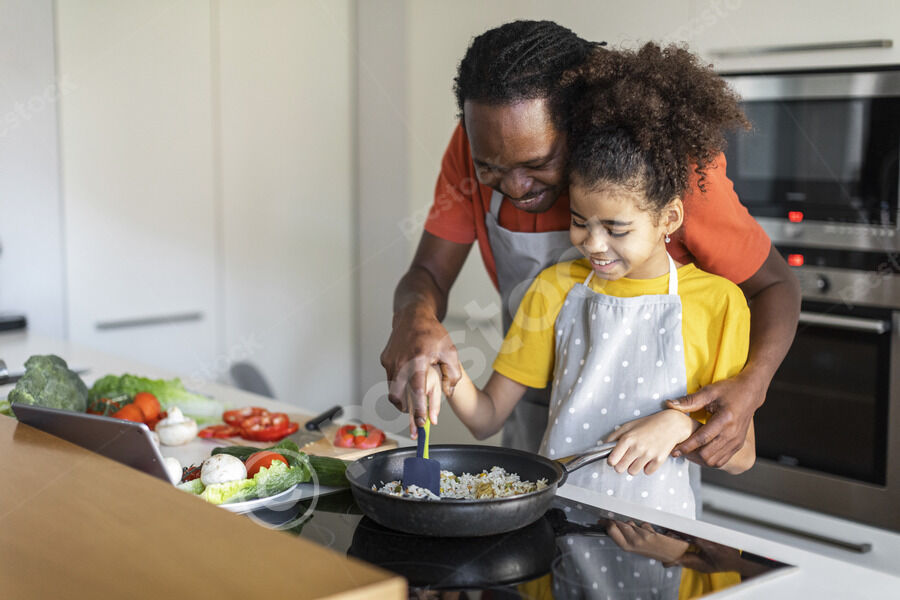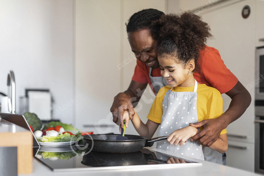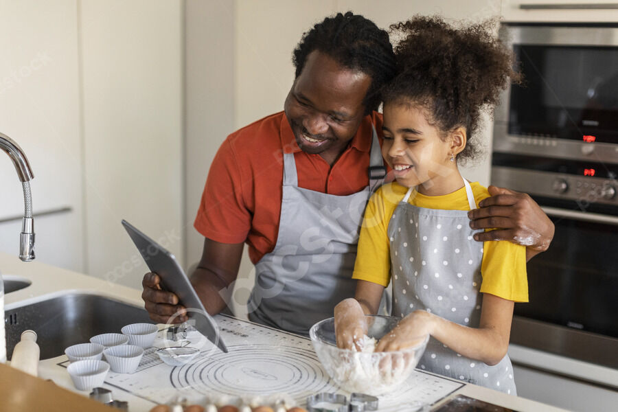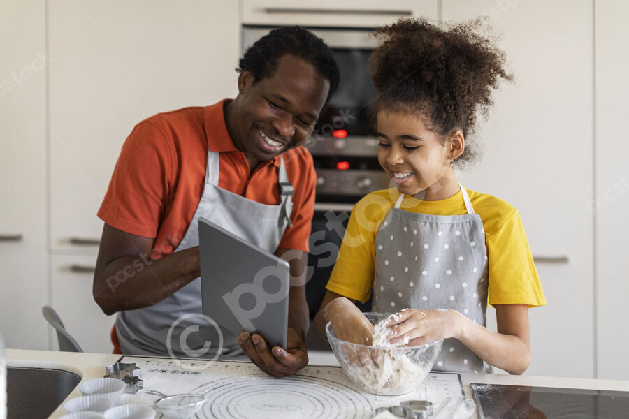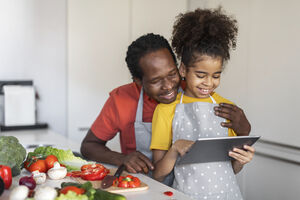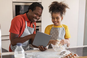 Smiling Black girl with curly afro wearing apron using tablet with her father while standing in kitchen at home