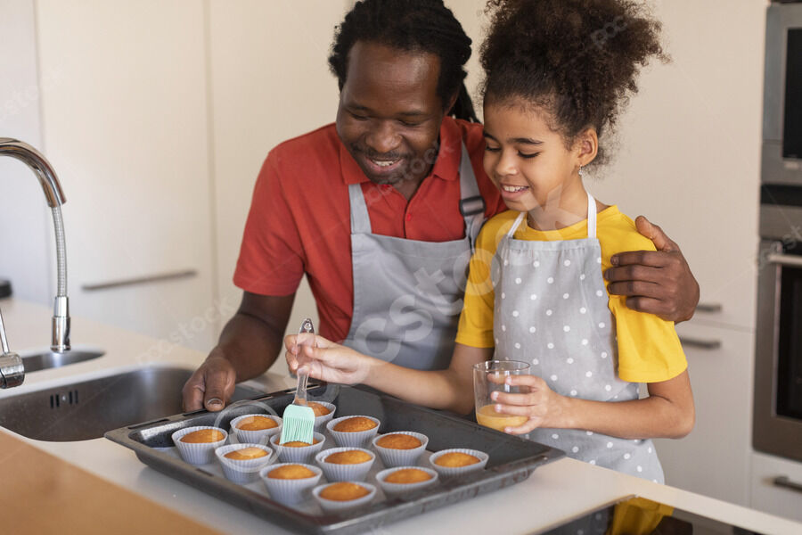 Black father and daughter wearing aprons brushing egg yolk on muffins while standing in kitchen at home