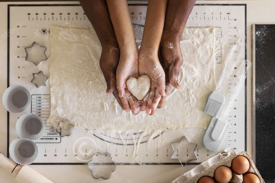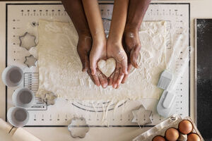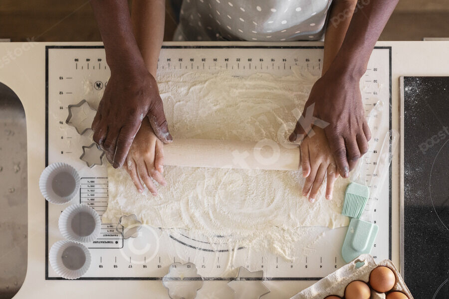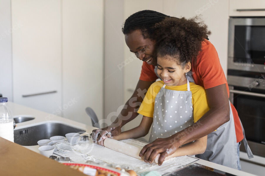 Hands of Black father and daughter baking dough together while standing in kitchen at home