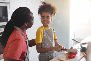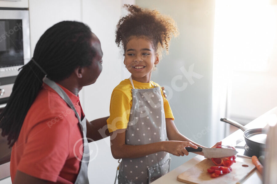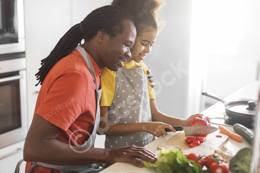 Black girl with curly afro wearing apron slicing bell pepper while standing with her father in kitchen at home