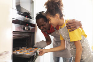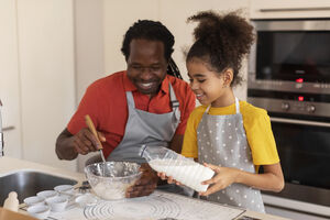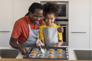 Black father and daughter wearing aprons baking muffins while standing in kitchen at home