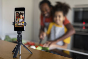 Smiling Black father and daughter wearing aprons preparing food recording video on smartphone while standing in kitchen at home