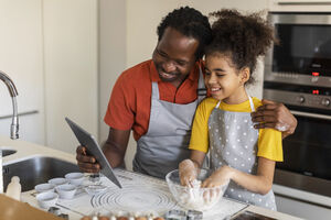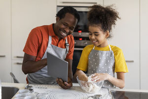 Smiling Black father showing tablet to her daughter baking dough while sitting at table in kitchen at home