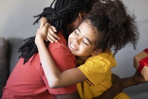 Smiling Black girl with curly afro wearing apron embracing her father while standing in kitchen at home