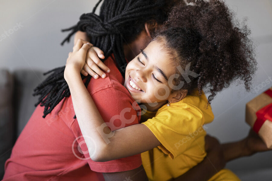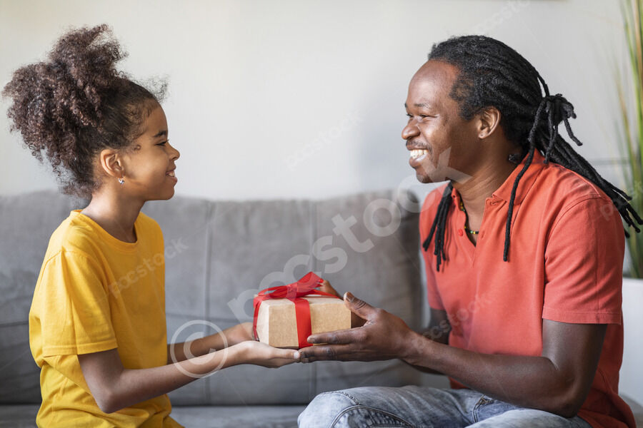 Smiling Black father with dreads giving gift to his daughter while sitting on sofa in living room at home