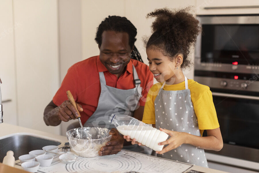 Black father and daughter wearing aprons having fun baking dough together while standing and sitting in kitchen at home