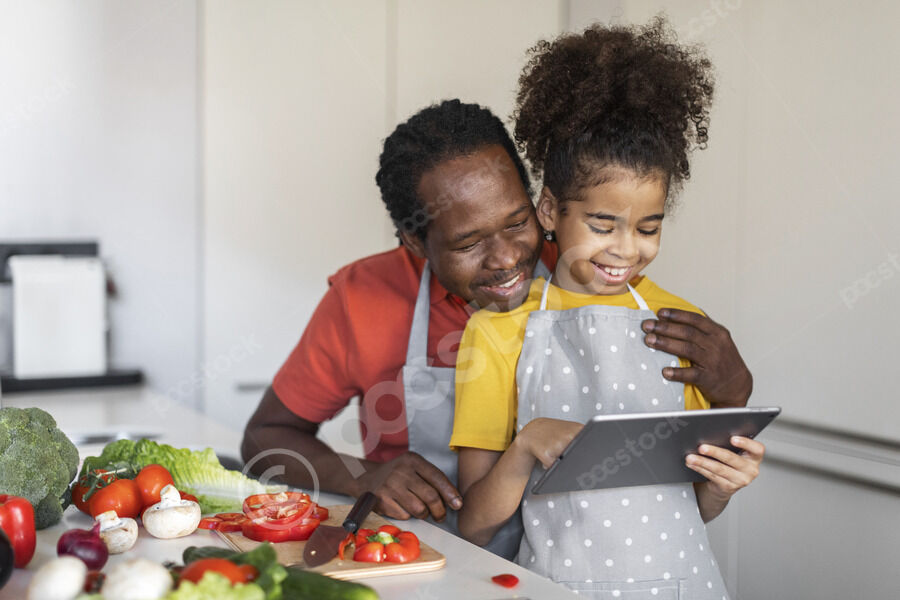Smiling Black girl with curly afro wearing apron showing tablet to her father while standing in kitchen at home