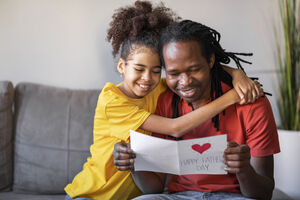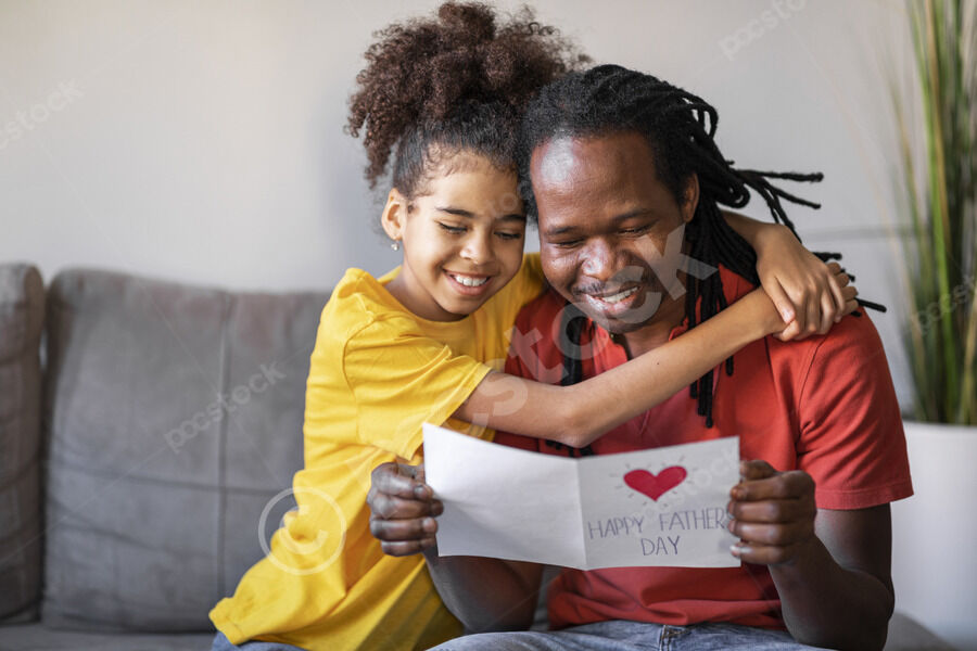 Smiling Black father with dreads reading letter while sitting with his daughter on sofa at home