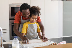 Black father and daughter wearing aprons baking dough together while standing in kitchen at home
