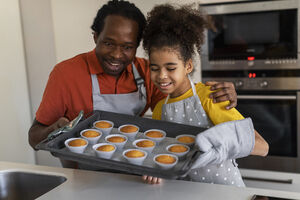 Black father and daughter wearing aprons holding tray with baked muffins while standing in kitchen at home
