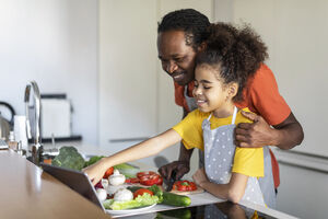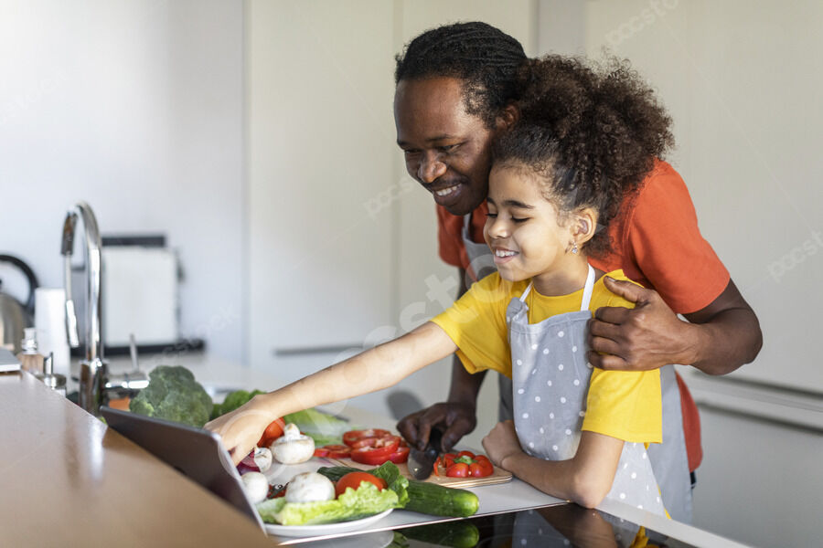 Smiling Black girl with curly afro using laptop preparing food with her father while standing in kitchen at home