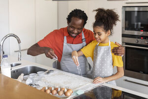 Black father and daughter wearing aprons looking at each other baking dough together while standing and sitting in kitchen at home