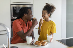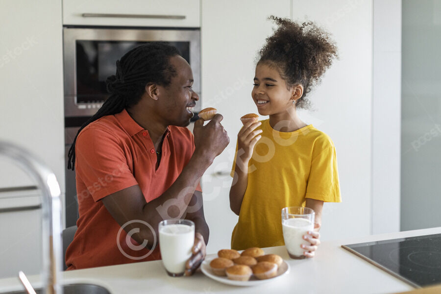 Smiling Black father and daughter looking at each other eating breakfast together while sitting and standing in kitchen at home