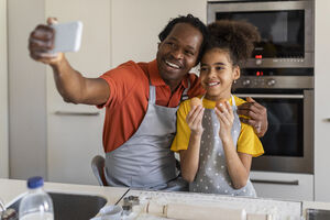 Smiling Black father and daughter wearing aprons taking selfie on smartphone while standing and sitting in kitchen at home