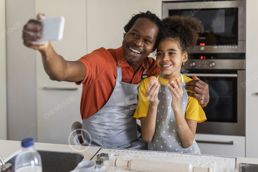 Smiling Black father and daughter wearing aprons taking selfie while standing and sitting in kitchen at home