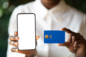 Smiling Black woman wearing blue turban holding smartphone and credit card sitting at table in cafe