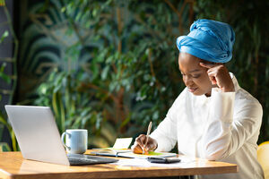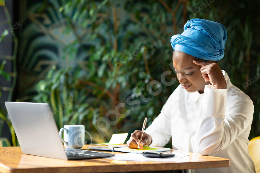 Black woman wearing blue turban taking notes while sitting at table with laptop and coffee cup in cafe