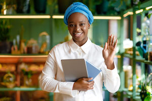 Smiling Black woman wearing blue turban waving hand holding tablet and notebook standing in cafe